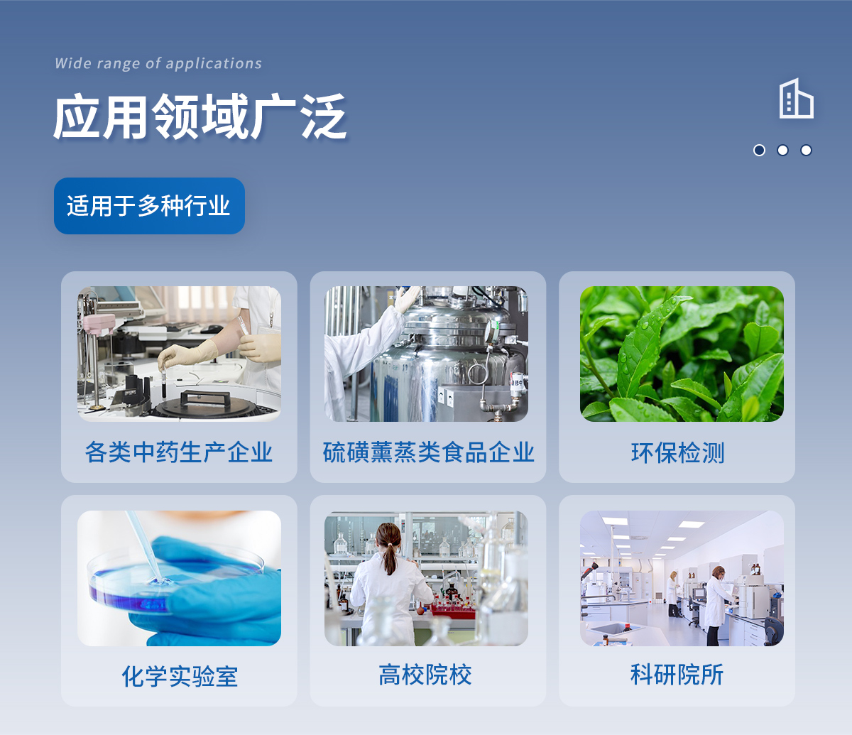 該儀器主要適用各類中藥生產企業,中藥科研院所,以及與硫磺薰蒸相關的食品生產企業等,用于常規二氧化硫殘留量測定。