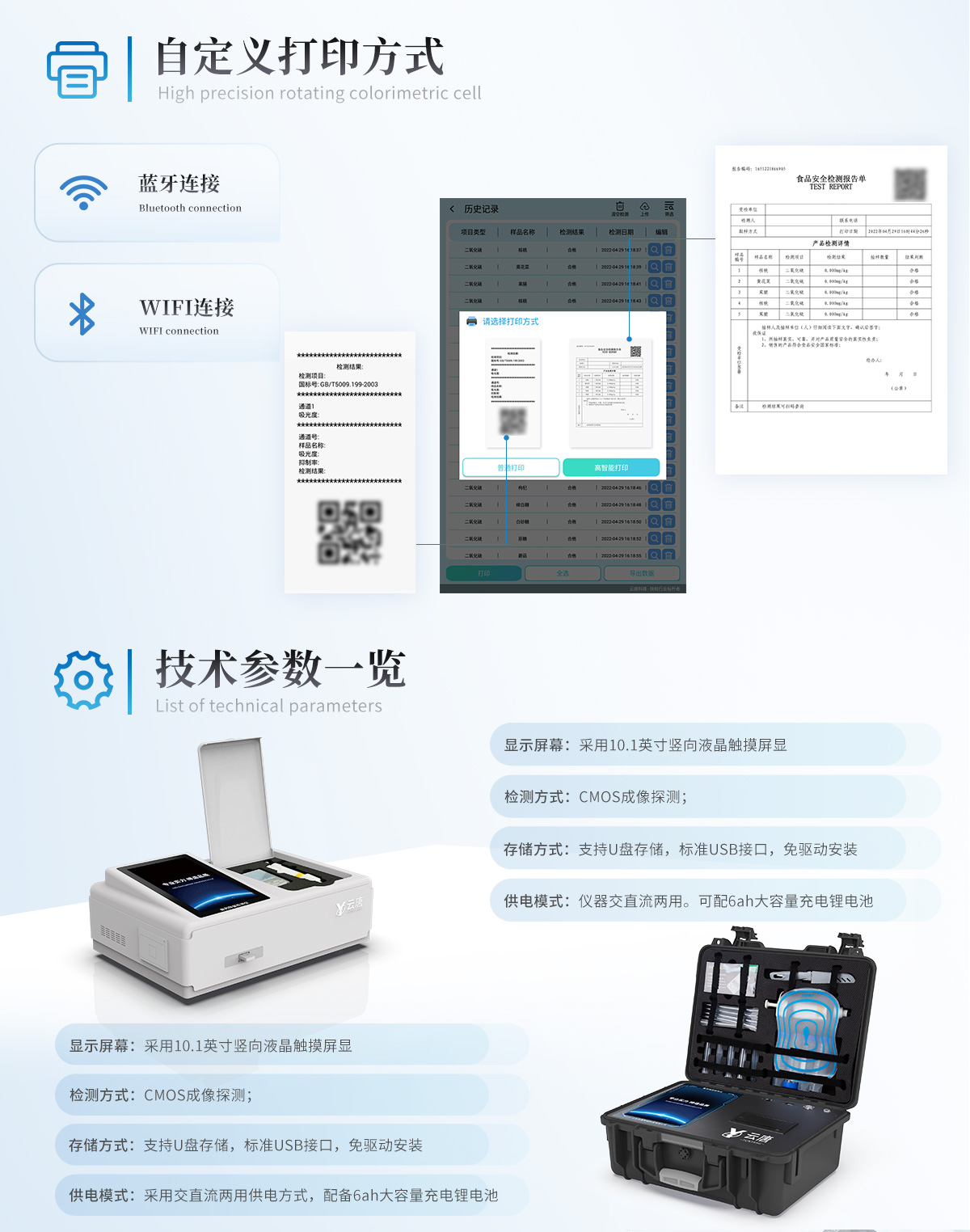 10、儀器具有 wifi 聯網上傳、RJ45網線連接功能,可以快速上傳數據。同步對接監管平臺,數據可局域網和互聯網數據上傳,檢測結果直接傳至食品安全監管平臺。進行區域食品安全監管及大數據分析處理與數據統計,檢測區域食品安全長短期動態,達到食品安全問題預估、預警。