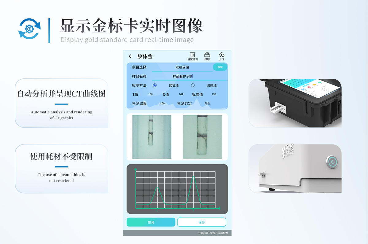 直插式自動掃描方式,可實時顯示金標卡實時圖像,系統(tǒng)自動分析并呈現(xiàn)出CT曲線圖,CT線自動識別,無需手動調(diào)整,完成檢測后自動退出檢測卡。